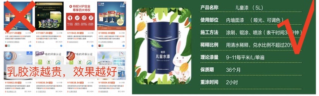错误原因:很多人认为无气味的油漆就是环保无毒可放心选购的,其实不然。现在很多商家通过添加香精或使用低味材料可轻松实现油漆轻气味、无气味,但产品依旧有很大安全隐患。左图中单纯根据气味选购油漆,非常不科学。