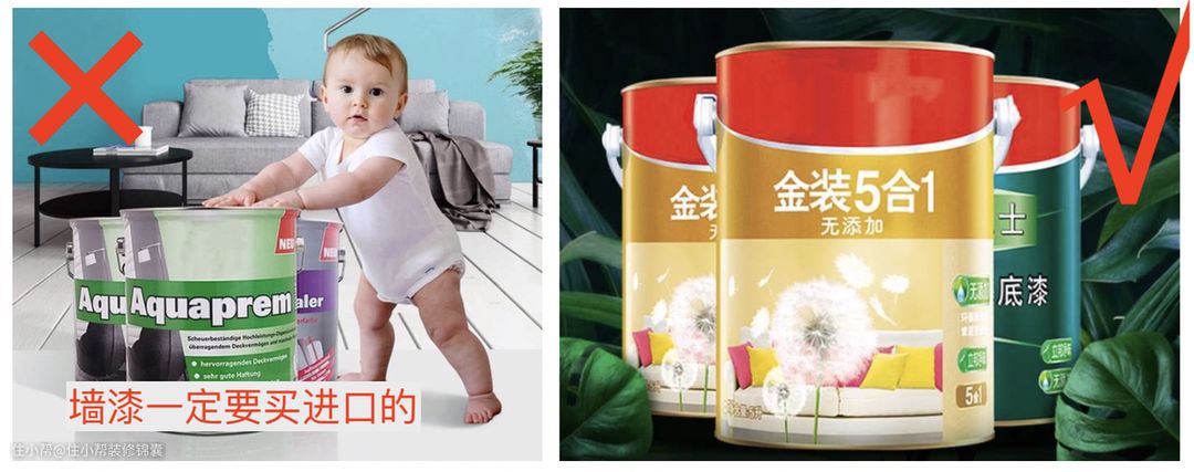 错误原因:近几年,很多人热衷购买进口墙漆,但进口漆并不适合国内家庭。①相较于国产墙漆,原版进口漆粘稠度高,兑水率底,因此费料费钱。②进口漆的涂刷方式和国产漆不同,对工人而言是一项挑战,如有不慎将很容易把墙面刷花。③欧美装修时是在石膏板上直接涂刷油漆,而国内装修是在腻子上刷漆,因涂漆表面不同,对漆的要求也不同。④进口漆利润大,假冒品较多,应尽量避免通过海淘、代购渠道选购。简而言之,一旦选择原版原装进口的墙漆,就得把国外一整套墙面施工工艺全搬回家,不推荐选购。