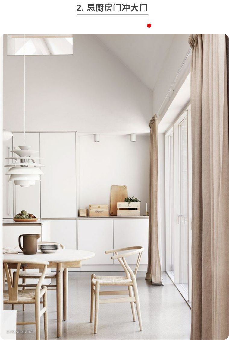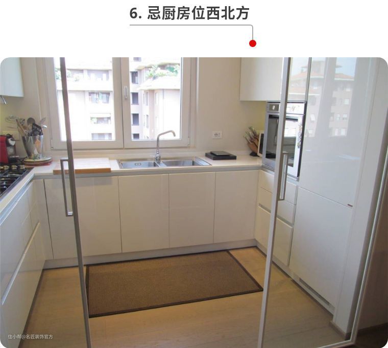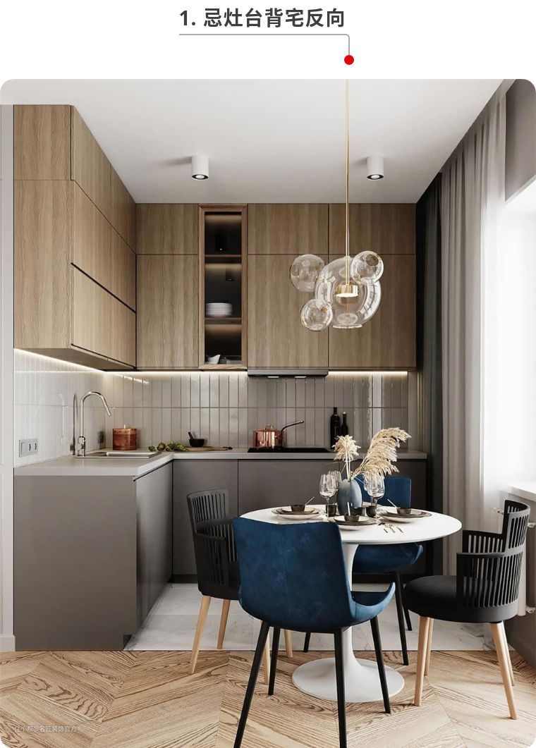厨房灶台的位置在设计时就要考虑好布局走向,特别是整体厨房,安灶原则是不能背宅反向。即灶口的方向不能和房子的坐向相反,使用电磁炉也要注意,开关朝向不能跟大门方向相反。