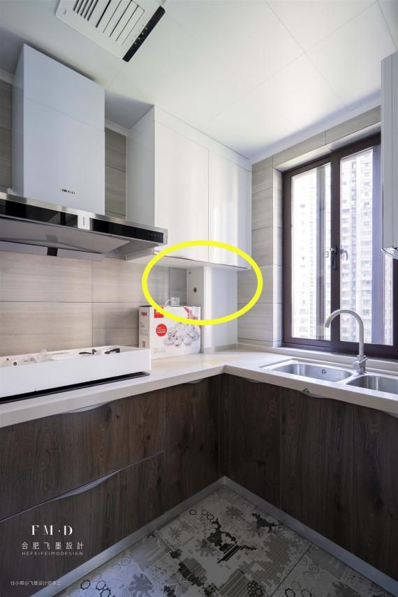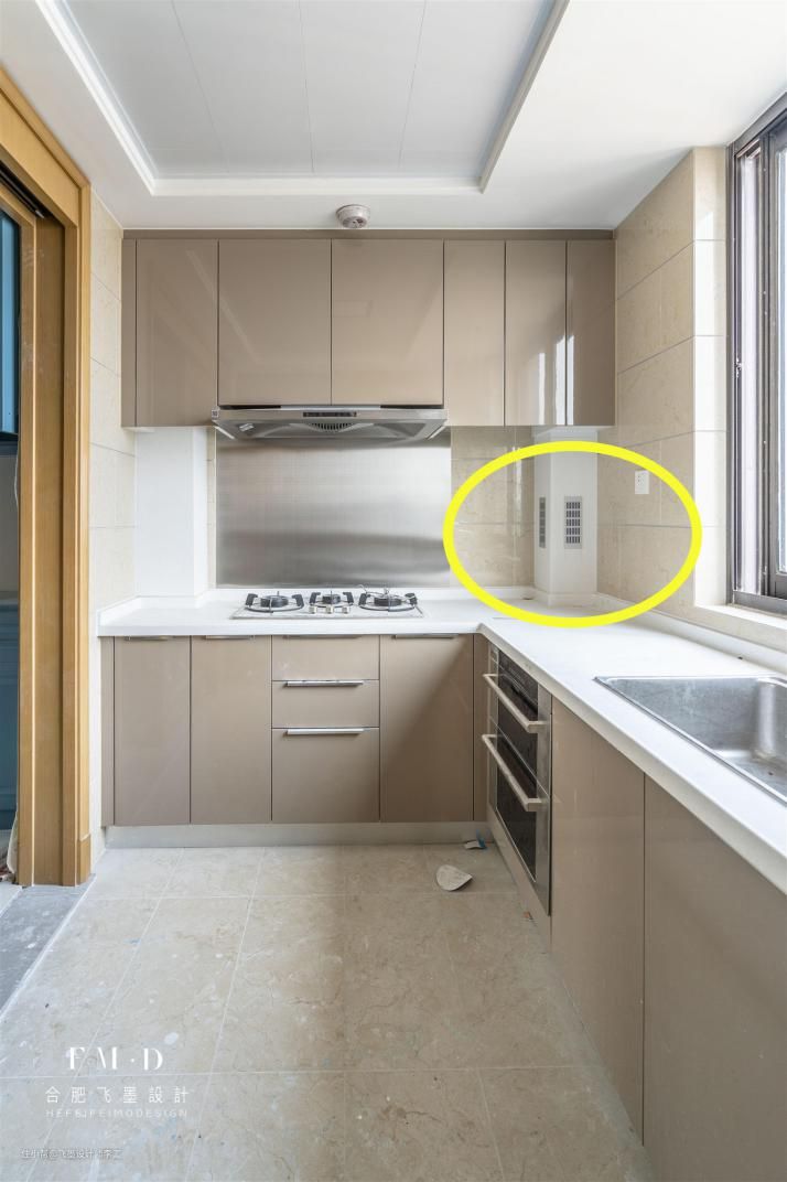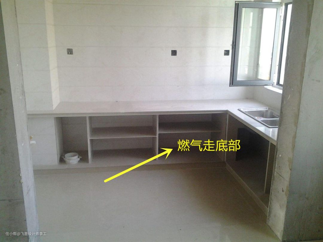 情况1:通常厨房燃气管道会裸露在外面,影响整体的美观度,为了美观,大家会采用包管的形式,这种情况下,跟燃气走底部一样,一定要记得留透气孔和检修口。