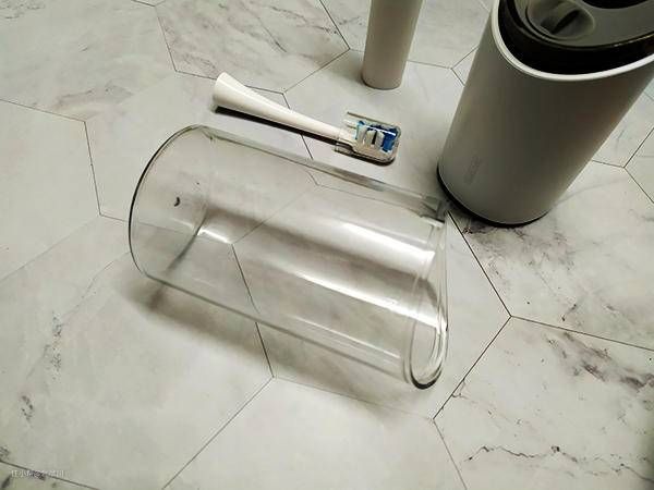 充电底座、漱口杯及若干配件等在其隔壁。全部拿出来后,我们可以发现,包括牙刷在内总共有4样物品,