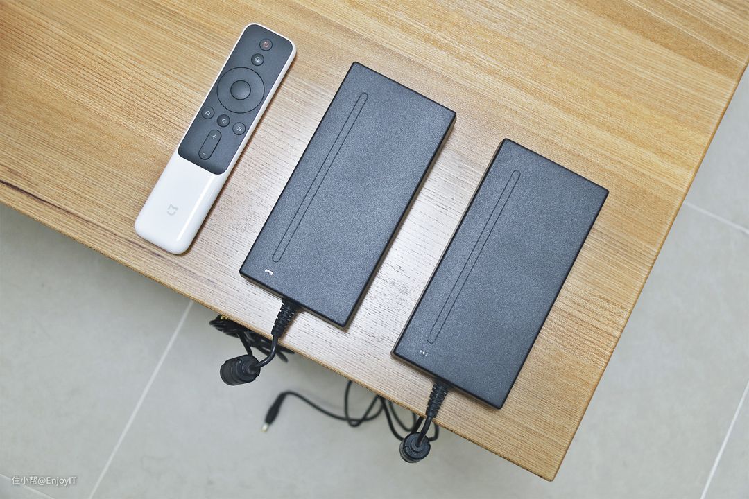 是不是觉得少了什么?对,这台投影内置了适配器进主机,就是那种传统笔记本电源线中间那块大大的电源适配器。我看看我上图,这是家里另外两个房间里拿过来的适配器与Vogue遥控对比大小,这两块板砖一样大小的适配器,在如今已经内置进Vogue投影机身内,方便接驳和搬动,算是了却了我多年的投影痛点之一。也看出峰米对自家供应链电源适配器配件的品质有足够的信心,如果用料不过关可不像以往直接换一个外置适配器那么简单,需要返厂拆机了。不要以为电源适配器不容易坏,之前在另一个国产投影的微信群里也见过不少用户说适配器坏掉的,显然是对配件供应链的品质把控不过关。