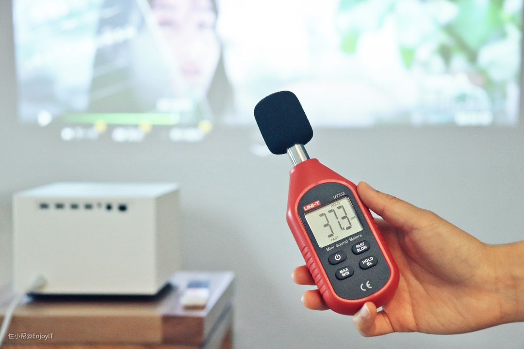 关闭门窗的室内环境噪音在35分贝左右。开启投影运行一段时间后,暂停播放,然后距离投影1米处可以听到风扇运行的噪音,但测得噪音仅在37分贝左右,几乎与我家的环境噪音一致,噪音控制不错,正常观影完全感受不到风扇的声音。