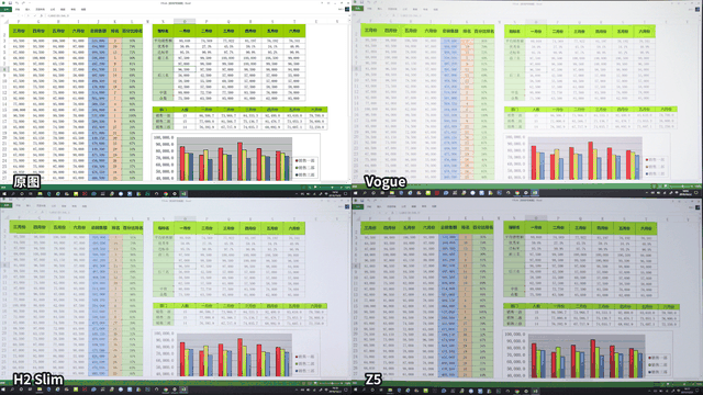 最后再来一组办公场景下文字细节表现,即便更多用于追剧看综艺的家用娱乐定位,但谁也不能限制用户的场景使用自由。他们也有可能会用来做PPT和Excel表格投影展示等拓展场景。这个文字和图表内容清晰度方面至关重要。上图是一个Excel文档的对比,我们放大后可以看到Z5由于采用菱形像素排列且只有720P分辨率,文字清晰度显然表现不足。接下来同为1080P的Vogue和H2 Slim对比,即便抛开流明,可以看到拥有锐度增强系统的Vogue投影画面的文字边缘依然更锐利清晰。