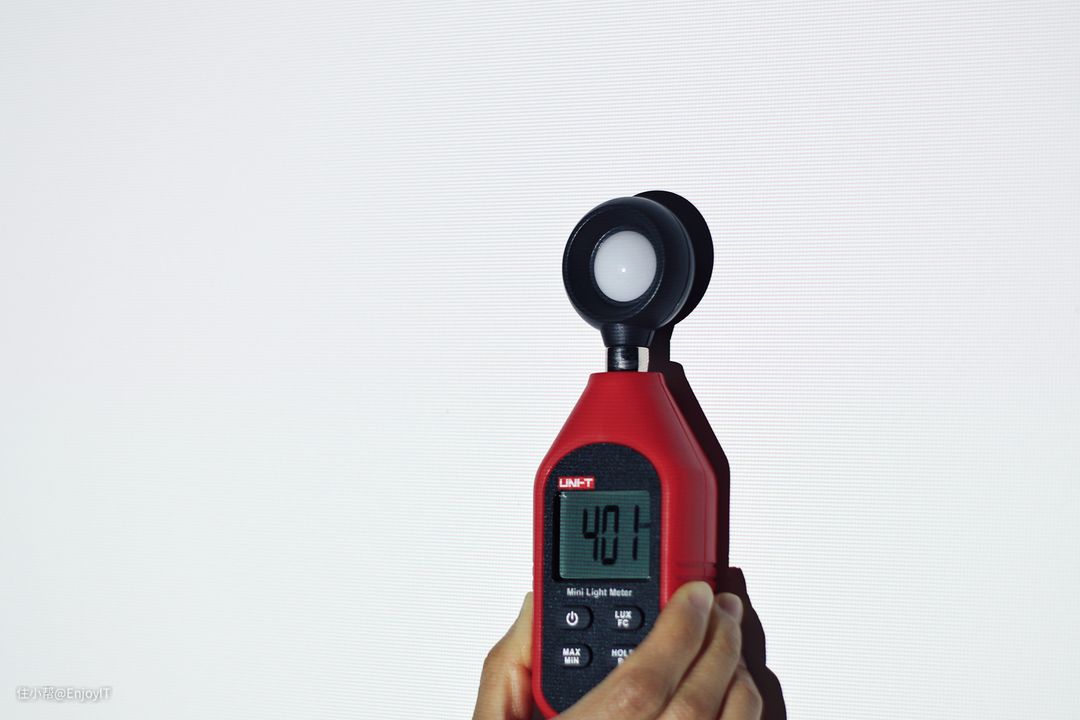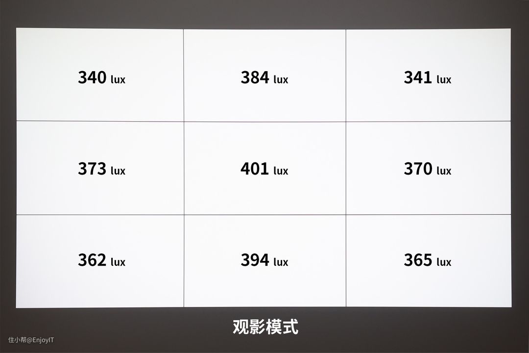 在无光源的室内测试,投影尺寸100寸,且不对任何参数做调整的默认标准模式下,用家用级仪器测得如上照度数据,取平均值乘以面积换算后约1020ansi流明。