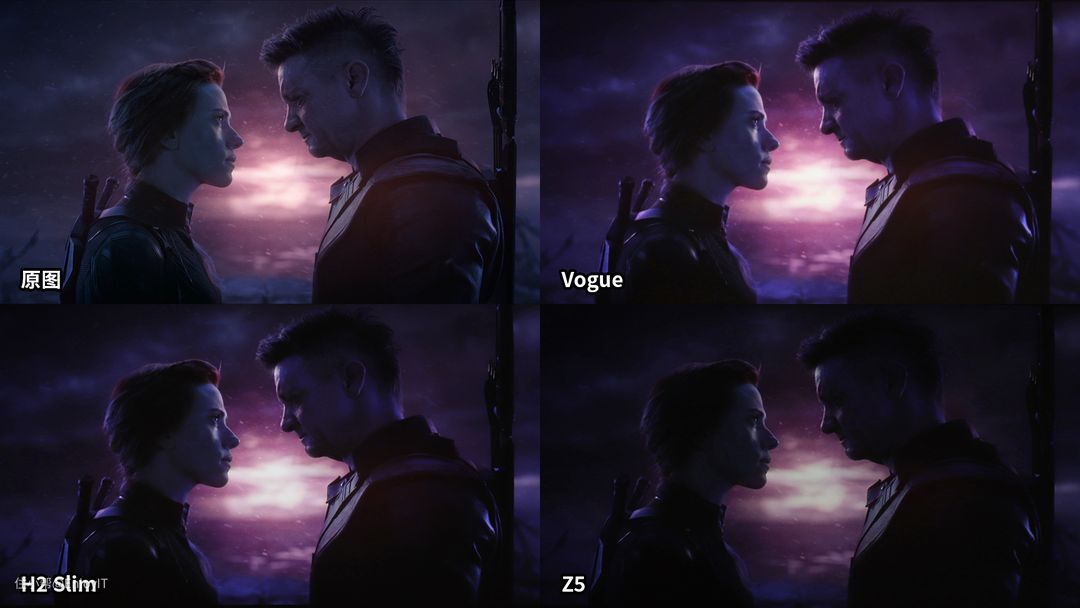 投影最大的挑战就是很多电影画面的表现,相当多的电影为了更佳渲染气氛和沉浸感(以及为影院样长灯泡寿命等~),画面都是相当的昏暗。譬如复联4的这个场景,原图画面处理的是相当漂亮,逆光下的大面积暗部细节是投影最大的功底考研,其实这三台投影都把画面剪影化了,但矮中取强依然是Vogue,两位主角的脸部背光细节尽可能多的保留,不过由于高流明的原因,画面比起原始影片更加鲜艳了,如果切换到高亮模式的色调会更加接近原版。