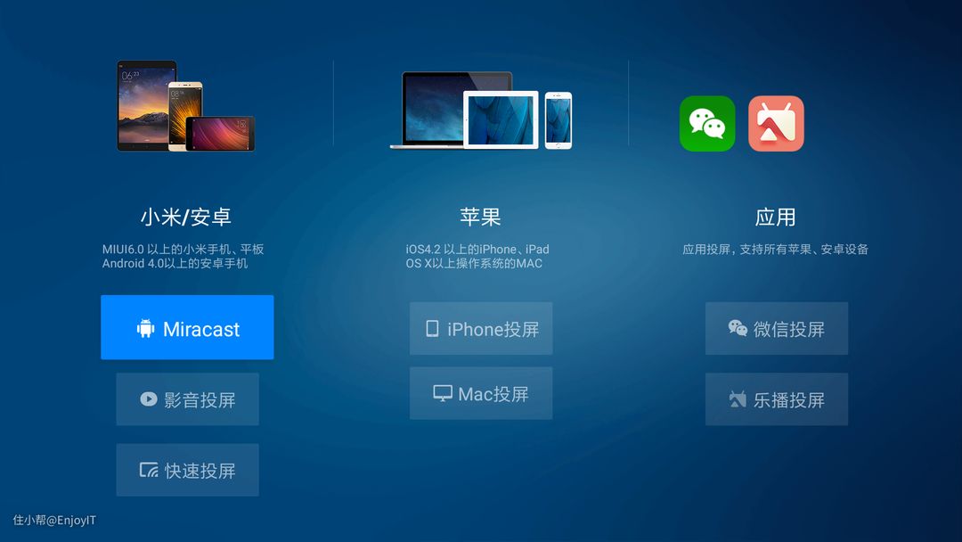 除了外部HDMI信号源输入,电视与盒子上常见的Miracast/Dlna/AirPlay无线投屏自然都是标配,有了这些,你都不需要开大屏会员,常规的手机端视频会员打开会员视频,就能投屏到幕布上享受更沉浸的观看体验。而且还不止如此,MIUI TV还少见的支持微信投屏,大大丰富了使用场景。