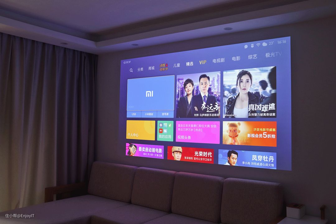 由于是众筹新品,网上相关介绍较少,自行整理了相关数据规格给大家先,如果错误还请指正。如今LED智能投影如同智能手机一样,几个关键硬件指标也容易区别大致优劣,单看数据亮点就是1080P分辨率+1500的安氏流明和预装MIUI TV,一个保证画面观感,一个保证软硬件交互体验。另外32G的内置存储也保证了你可以安装足够的第三方APP。PS:官网数据里净重把3.51kg写成了3051kg,不知道现在改了没。