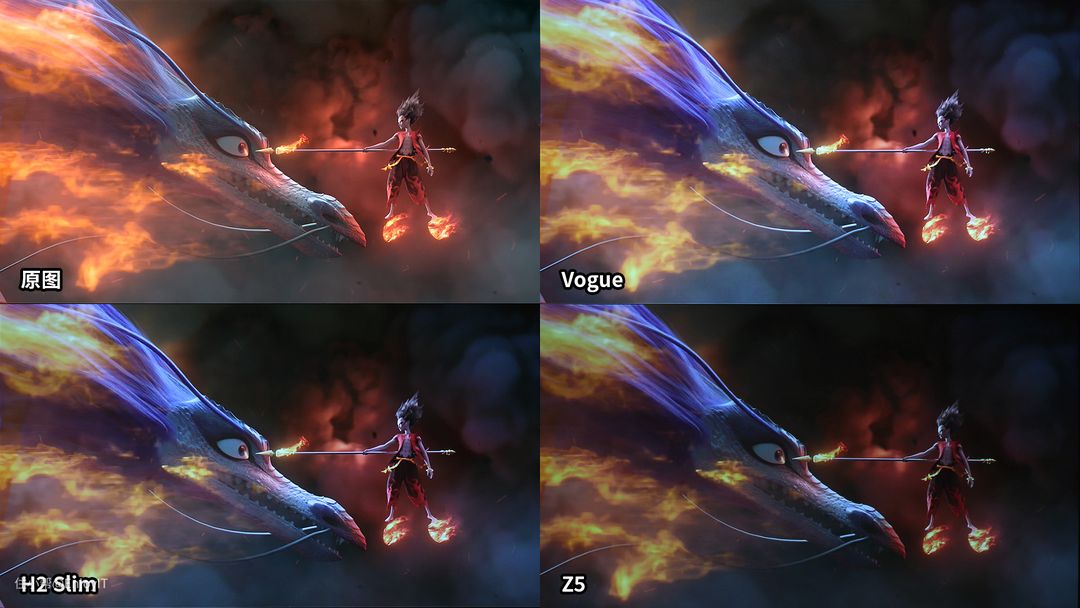 第二组是前段时间较火的哪吒的截图。这个经典场景用投影来表现最大的考验就是背后的烟火纷飞的细节,只有足够的细节还原才能足够衬托前面两个人物主体,让画面饱满。没有对比就没有伤害,这三台里显然又是Vogue还原度最佳,一白遮三丑用在这里也合适,只有Vogue最大程度还原了背后的烟火纷飞的暗部细节。