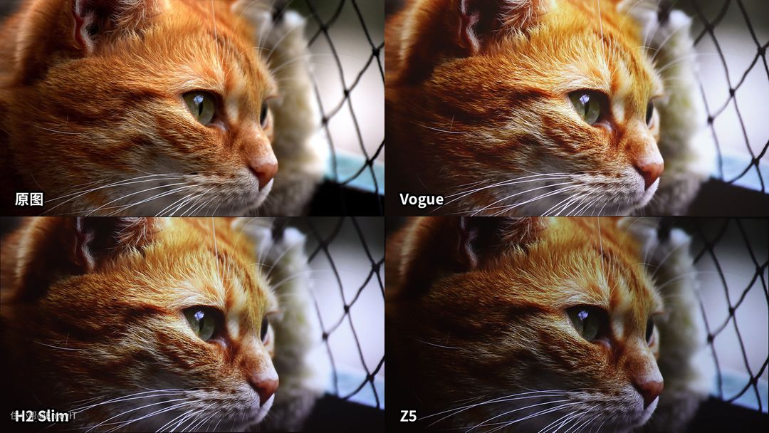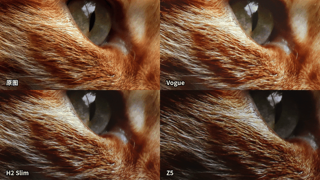 继续看这组,等比放大,要是上传后图片不被压缩过分,那你们应该可以看到高流明加1080P分辨率的优势,Vogue和H2 Slim在这部分细节表现都达标,继续细看猫眼里的反光,Vogue拥有更佳的锐化细节表现,H2 Siim次之,仅有720P的Z5即便抛开流明,画面细节表现依然不足。