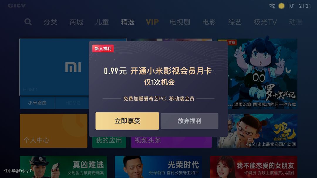 由于MIUI TV近来放弃了内容贫乏老旧的CNTV,转投GITV合作,而这个银河互联网电视(GITV)也有爱奇艺的参与建立,在首次进入MIUI TV弹出的0.99元开通小米影视会员月卡其实也就相当于是让你九毛九体验一个月的爱奇艺会员,而我除了爱奇艺,其它都有会员了,也正好可以体验下。