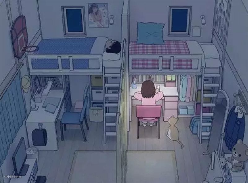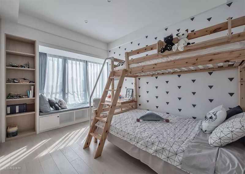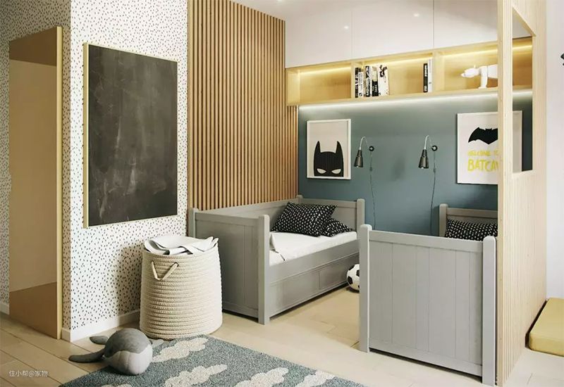 当然如果为了美观,并且考虑到双方互不打扰,可以在两孩子的床中间设计隐藏式挡板,在睡觉的时候将挡板拉出来,自然就形成了两个单独的私密空间,瞬间就像多出一间房一样。