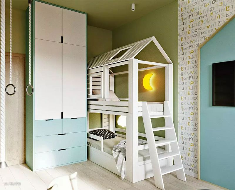 如果空间太小,容不下两张并列的床,那么在设计上下床的时候,可以将其错落开,这样无论孩子睡上铺还是下铺,都不会感到压抑。