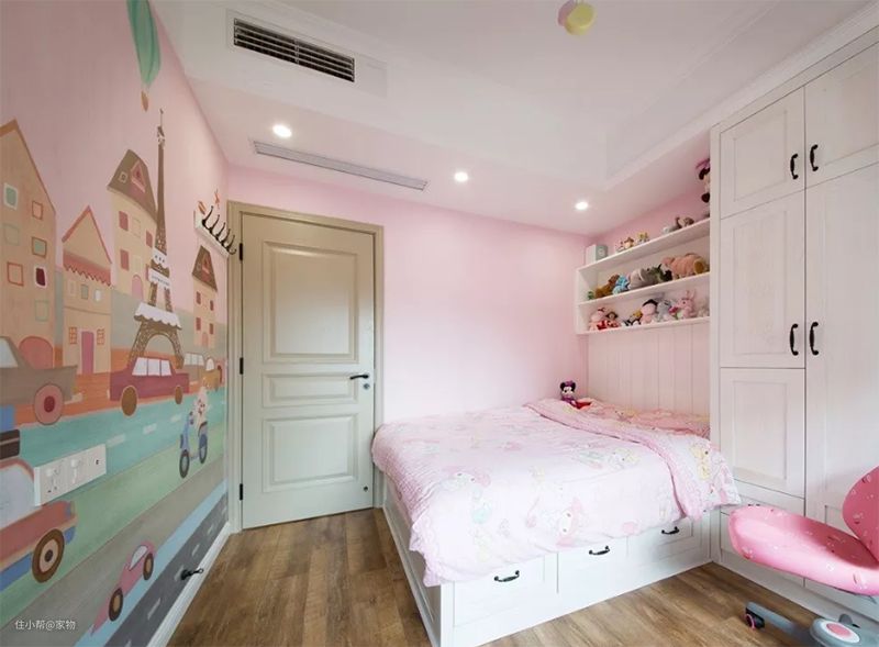 如果家里有两个女孩的话,可以打造一款双人榻榻米,墙壁位置可以打造搁板,将一些毛绒小玩具收纳在上面,剩余的空间,可以打造衣柜和儿童学习书桌,这样的女儿房简直不要太温馨。