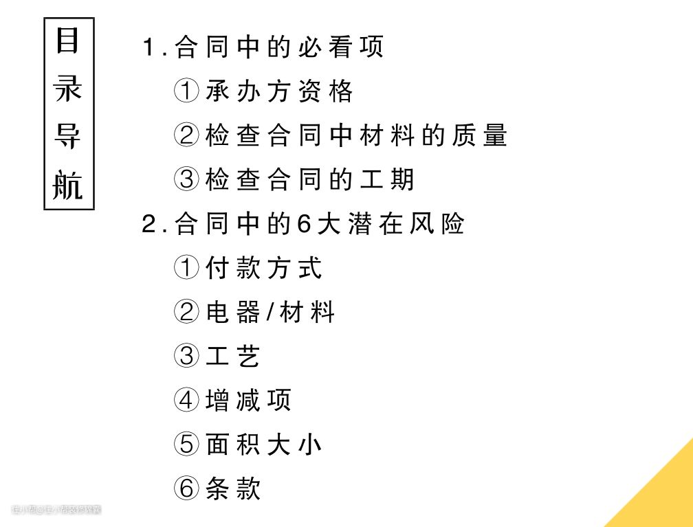 ①在合同签订前弄清自己所需要的材料、施工程序以及服务项目,在施工图上注明具体的施工做法和材料品名,作为合同附件。
