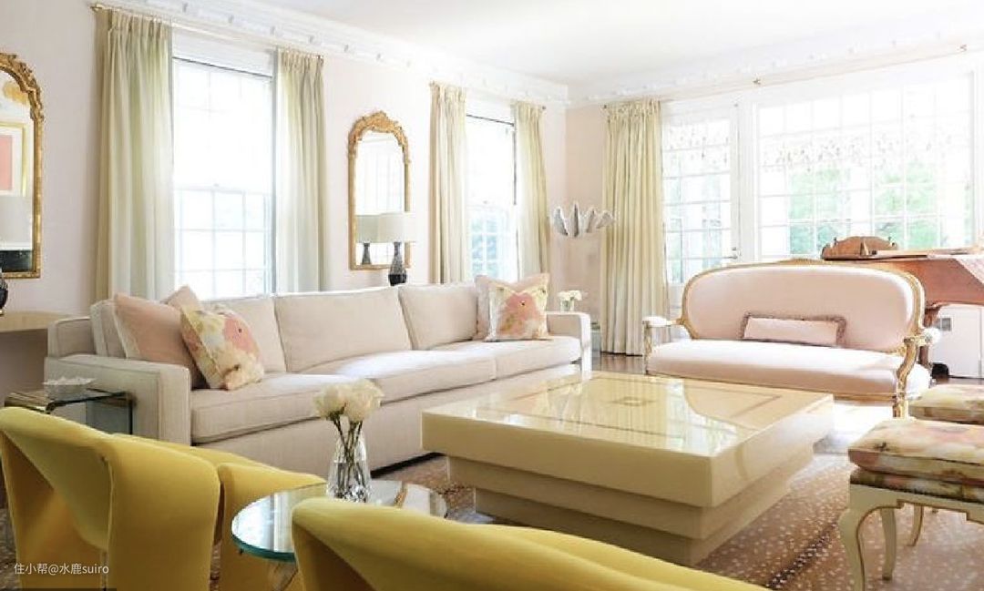 这个客厅用鹅黄色的窗帘搭配浅粉色和柠檬黄沙发。整个客厅光线明亮,所有这些自然的颜色有机地结合在一起,就像一个花园。