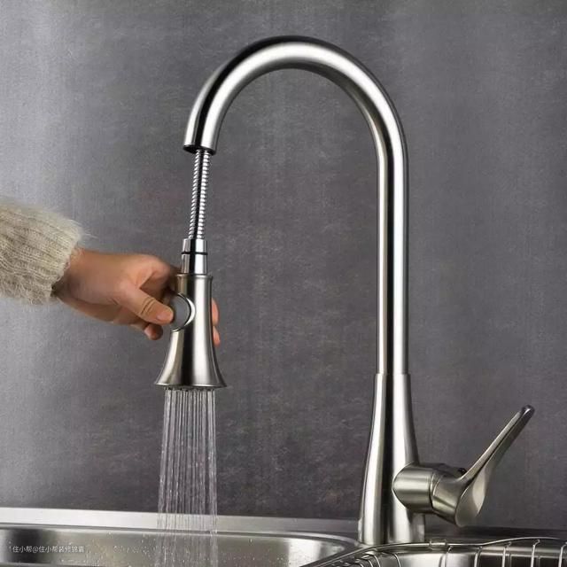 抽拉式水龙头操作简单、便捷度高,装在厨房可轻松清理水槽边角污垢,装在卫生间可轻松解决女生洗头烦恼。