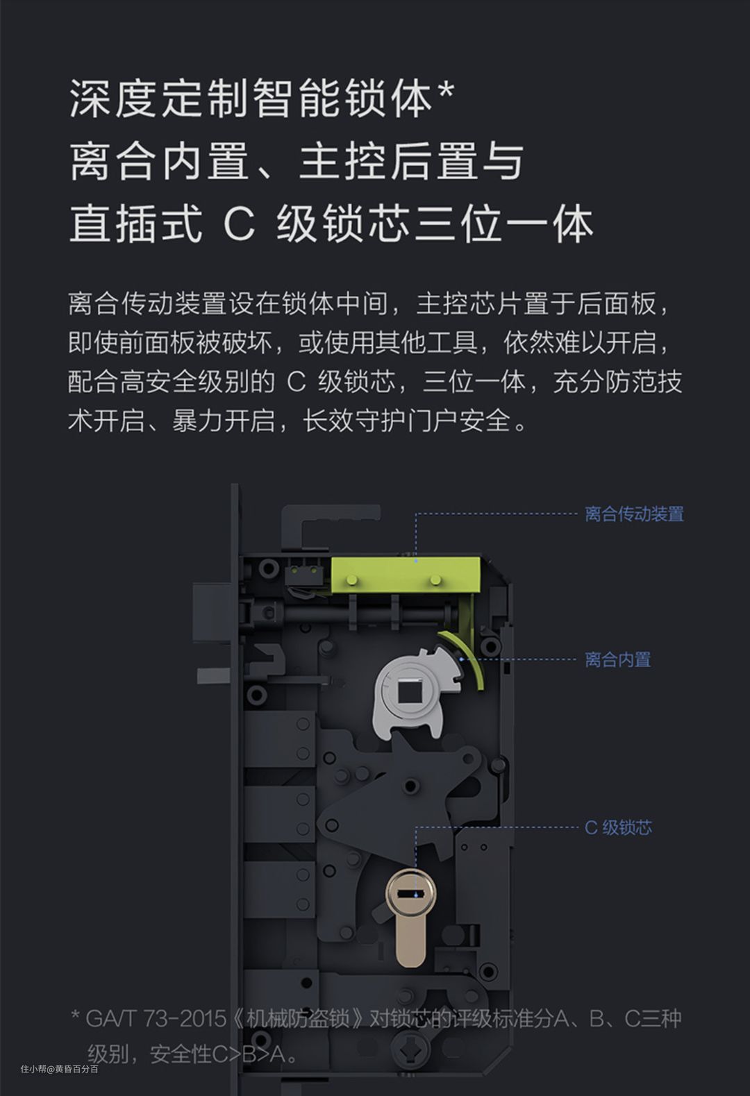 ▲直插式C级锁芯,算是安全级别里面最高的了,尤其配合上智能安防系统,所以有人来撬门,门撬开之前,就已经报警了,安全性还是不错的。