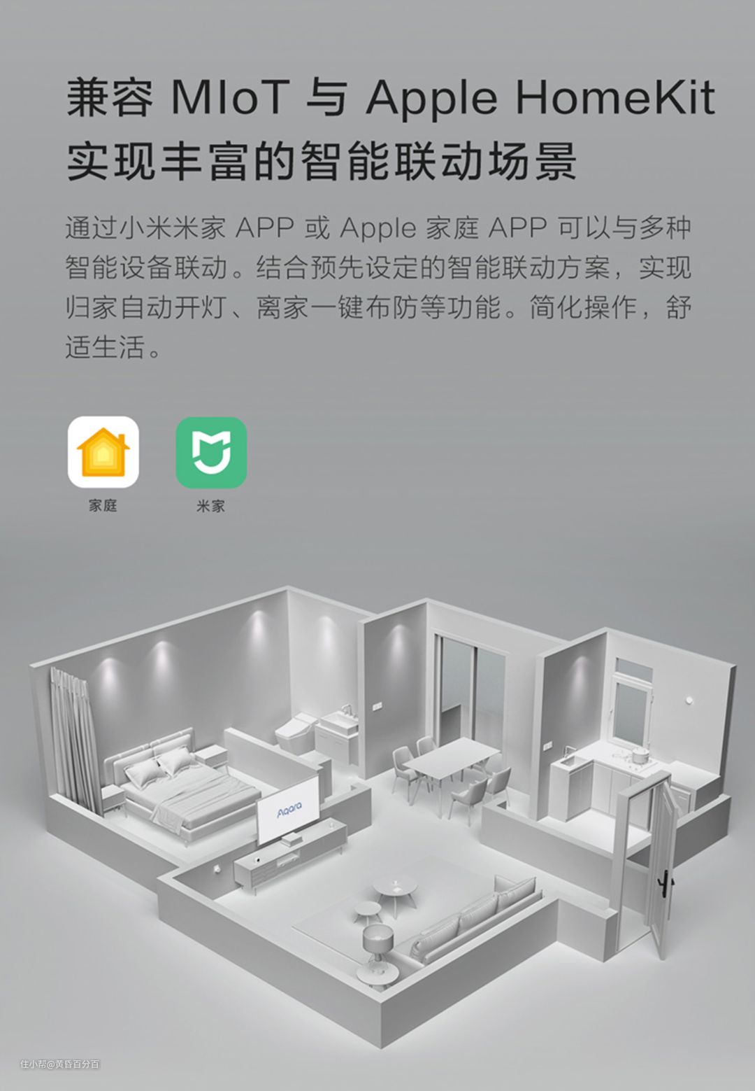 经过细心考虑,最后决定基于homekit进行旧宅改造,原因主要有两点,第一点是米家兼容的产品基本都集中在国内进行销售,所以如果我在澳大利亚,如果想买冰箱或者电视这类的兼容米家生产系统的智能家电会比较困难,会无形中给我未来澳洲的家电选购带来困扰,基于homekit的话则不需要有这种担心。另一个原因则是,经过我的研究,在中国大陆,实际上homekit生态圈和米家生态圈的重合度还是挺高的,国内也有很多物美价廉的产品,如果这些产品在老家的旧宅改造中证明了自己性能可靠的话,未来在澳洲购买或者建设自己的居所的时候,便可以从国内购买这些商品,从而做到既节约成本又提高体验的效果。比如Aqara便是用同时兼容homekit以及米家两个生态圈的品牌,而且质量功能应该不错,还得到了苹果和小米的双重认证,在苹果官网以及米家商城上都有卖。