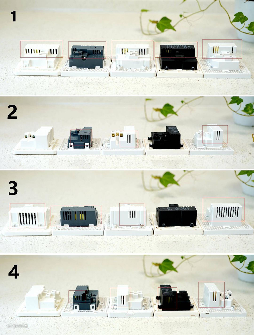 这张图是四个方位的散热孔情况,可以看到西门子和ABB的散热孔只有两边有,另外两边是没有做散热孔的,罗格朗、施耐德和西蒙都是四边都有分布散热孔