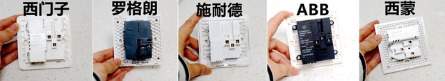 再看看背面,背面很清晰的可以看到,西门子、施耐德、西蒙都是白色的,材料也都是PC料,而罗格朗是深灰色,ABB是黑色,材质上面来看,罗格朗比较像尼龙66的质感,ABB比较像ABS料