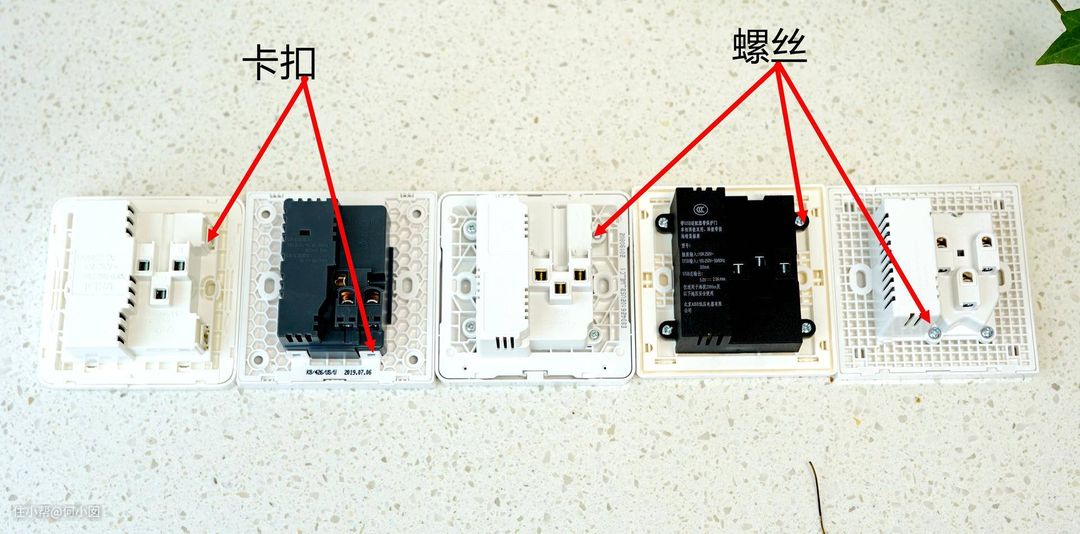 后座的固定方式,西门子和罗格朗是卡扣式,施耐德、ABB和西蒙是螺丝固定的