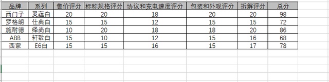 协议和充电速度评分:西门子和施耐德相当都得18分,西蒙协议少了一个得16分,罗格朗和ABB基本相当都得12分