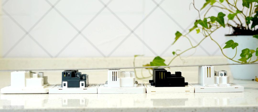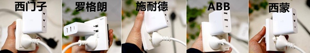 五孔间距方面,西门子和ABB都较大,而施耐德和西蒙都偏小,罗格朗两孔竖式,独树一帜,厚一点的USB插头就无法同时插进2个。