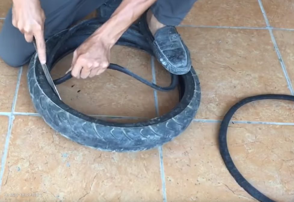 1:处理废旧的轮胎。找来4个废旧的小轮胎,将其中1个轮胎里面的内圈橡胶给切割掉。