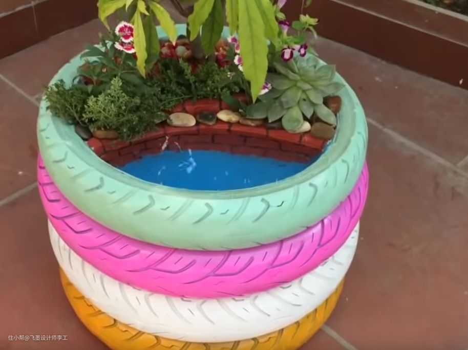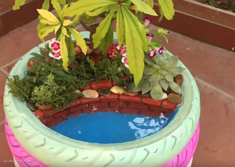 这种利用废旧轮胎打造得到迷你花园,不占用室内空间面积,还满足很多业主对于庭院花园的追求。