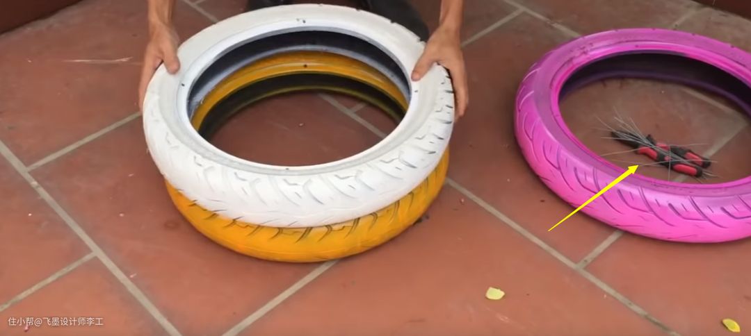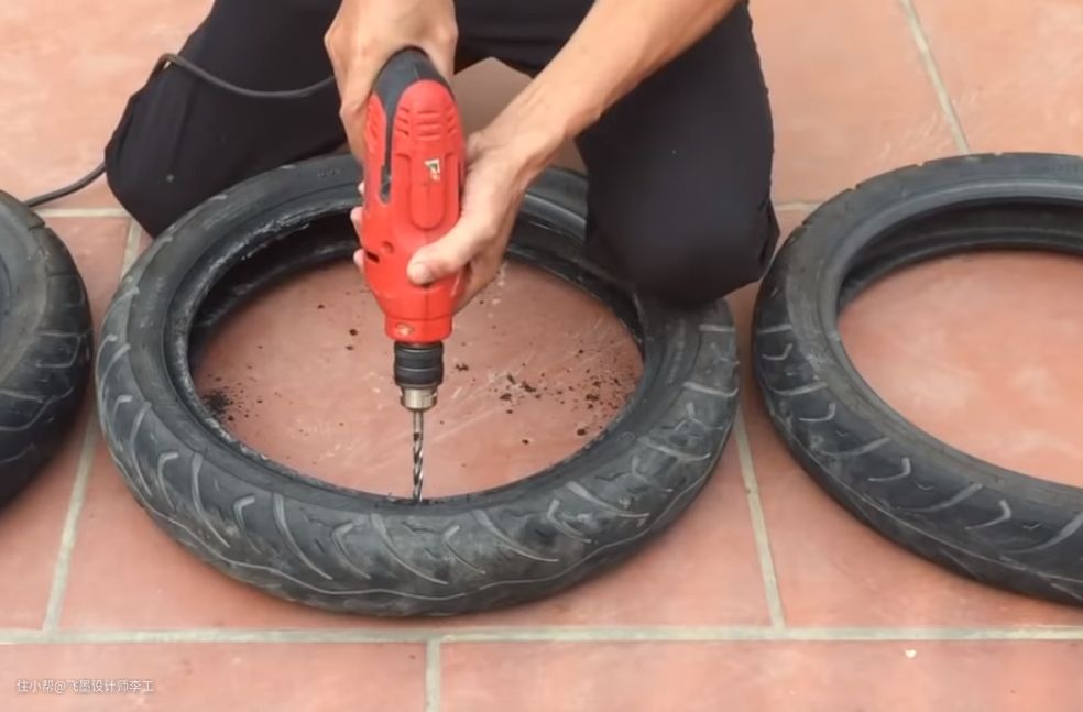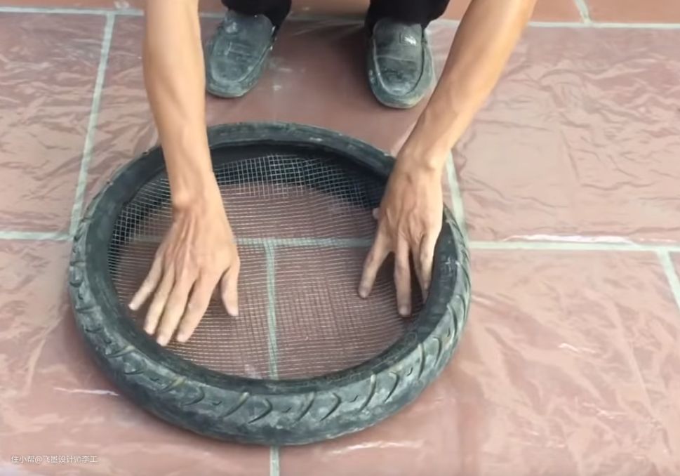 2:给轮胎加上“底座"。按照轮胎的内径,切割一块圆心的钢丝网,将它放到轮胎中间空隙处。