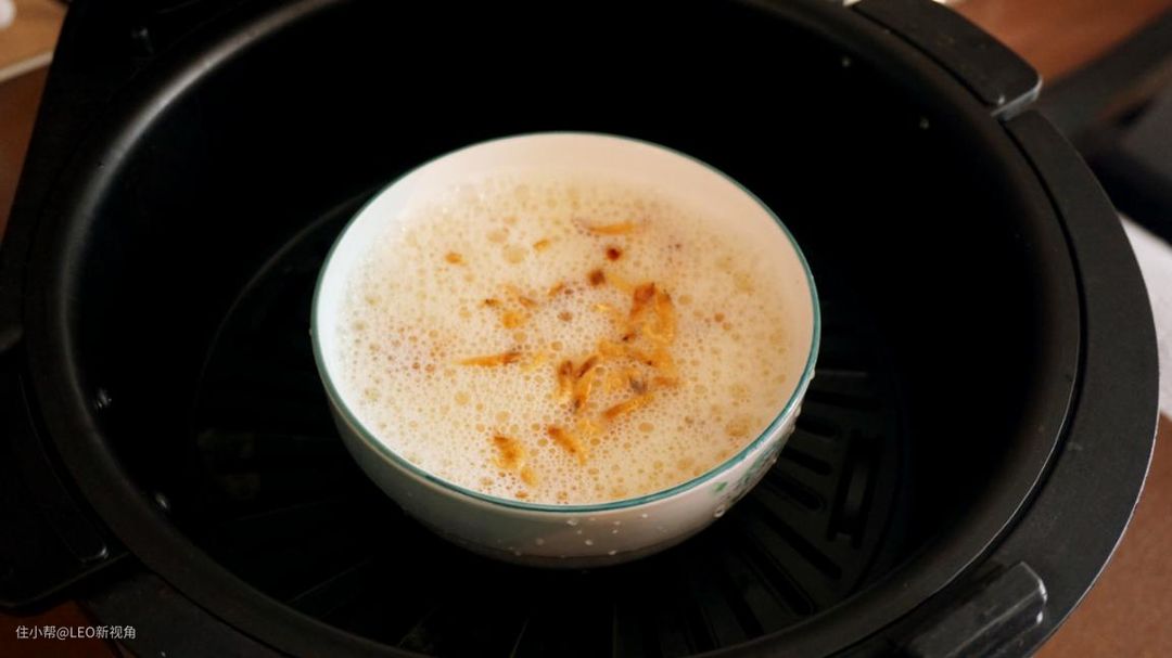 很多人都经常问,为什么自己煮的水蒸蛋总是很水,感觉很松散。其实蒸蛋羹有一个秘诀,首先鸡蛋尽量使用正宗的土鸡蛋,那样颜色会更黄,蛋香味更浓,也容易成型。而如果使用超时买的鸡蛋,那颜色没办法变了,如果要更成型就需要多打两个蛋。当然,这个只是选材上,真的要凝结,其实是将鸡蛋打散后,加盐调味,然后倒入适量的温开水,我一般使用70℃的水,正常65℃就可以。没有九阳空气炸锅,那就要盖个保鲜膜,戳两个洞隔水蒸,有九阳空气炸锅就直接用虾仁蒸蛋模式,放上去20分钟就能搞定。