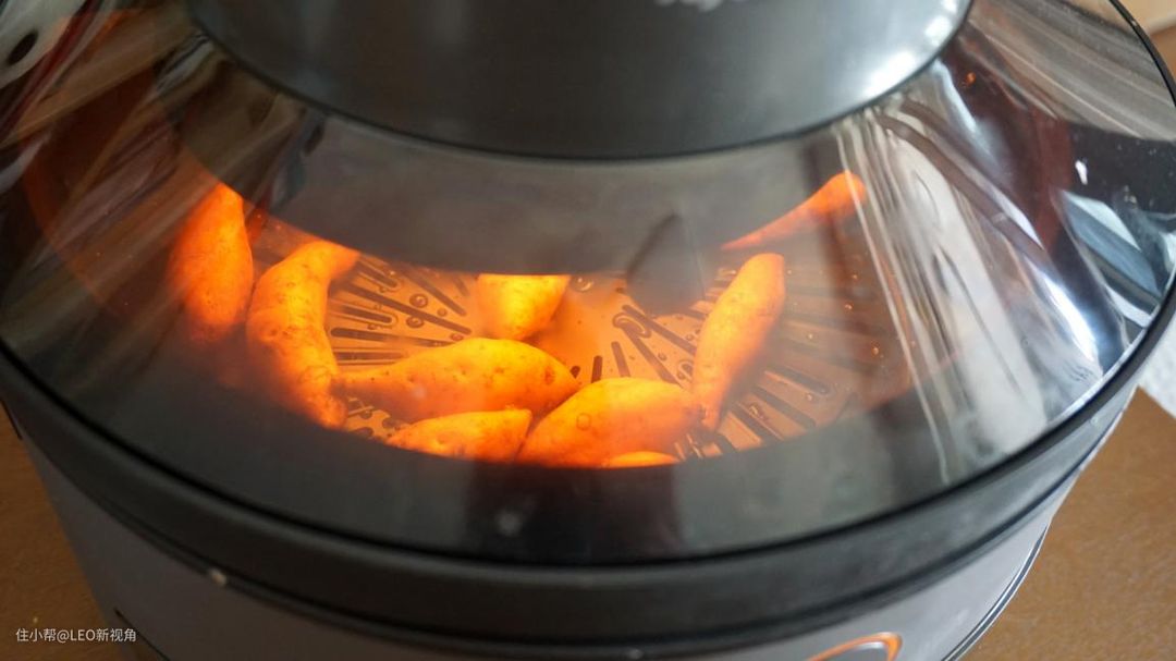 这次买的是紫云红心番薯,个头比较小,基本是一口一个,但很甜。原来都是在锅里水煮,大大影响了口感。刚好在九阳空气炸锅有窖炉红薯功能,就试了下。因为红薯个头不大,所以实际烤好的时间大概在16分钟左右。在烤制过程中,锅内会有间隔亮灯,这时可以看到里面的食材颜色变化。烤好后,其实会发现表皮并没有焦,而且干结,皮变的很有韧性,掰开一个红薯,里面嫩黄嫩黄,还保留少许的水分,口感香甜,一盘番薯大概不到五分钟就全部干完了。