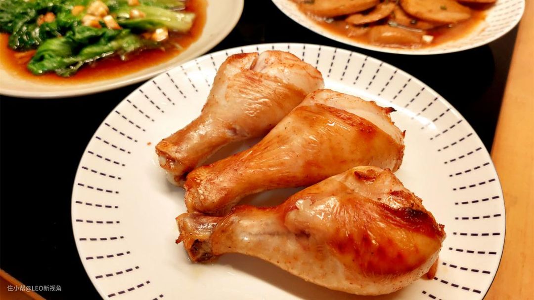 原本想做个奥尔良烤鸡腿,不过第一次尝试,腌制的时间不够长,中间也没刷料,表皮看上去色泽偏白。不过口感上外焦里嫩还是非常不错的,但最里面的肉没有腌进味道,下次记得要在表面割两刀,不仅在腌制时更加入味,烤的时候也可以更彻底。