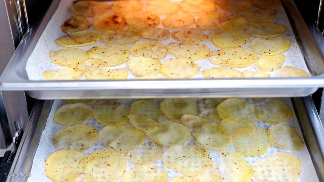 凯度蒸烤箱程序:上下烤加热风,预热200度,烤大概10分钟左右,根据自己烤箱的温控准确性、烤箱大小和土豆片切片的厚薄程度来增加或者减少时间,最后两分钟的时候注意观察一下上色情况和酥脆度,如果不够就延长时间,不用翻面