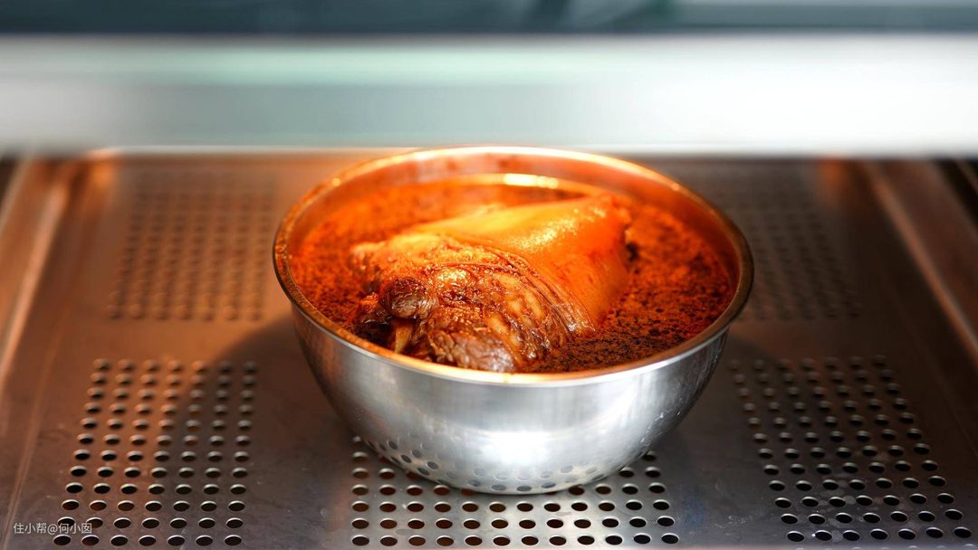 因为每个人买的猪肘的大小不同,猪的老嫩也不一样,口味上能接受的软烂程度也不同,但是这道菜尽量烂一些,会比较好吃,所以时间上是需要做调整的,仅供参考,建议是40分钟的时候,打开看看,用筷子戳 一下,觉得够软就可以了,我大概是走了一小时左右的高温蒸115度程序,拿出来之后转一个小锅,直接收汁到满意的程度就好了