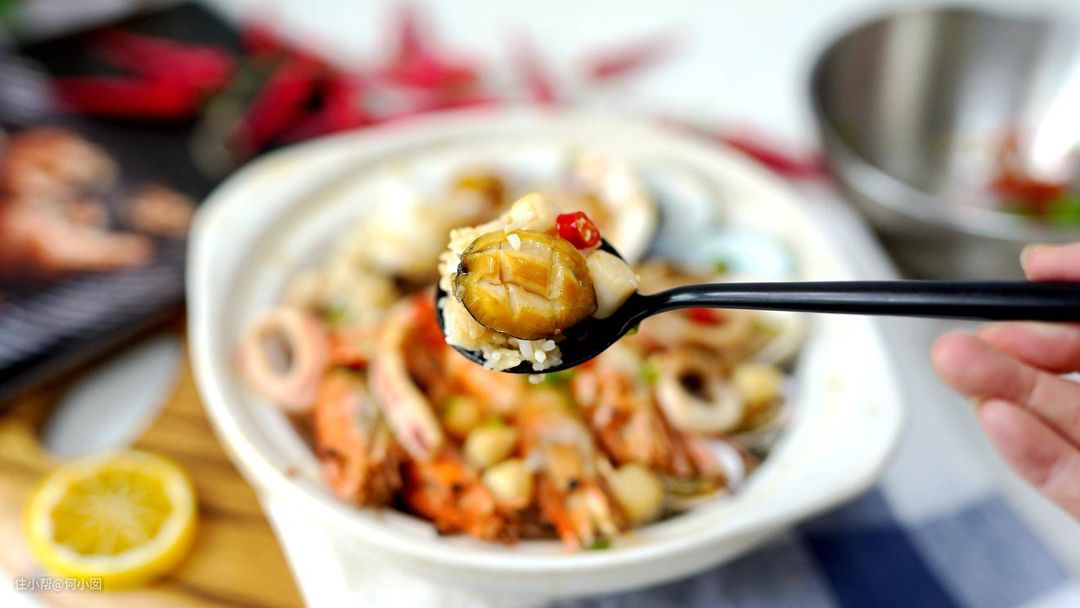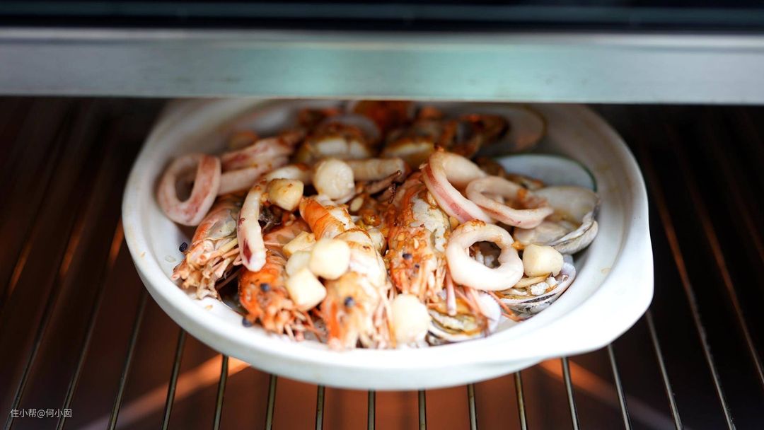 米饭用黄油炒一下,然后放入砂煲,把刚刚焯水的海鲜铺在米饭上,放进去蒸烤箱,使用小面积烧烤模式,加003度蒸汽,蒸烤20分钟