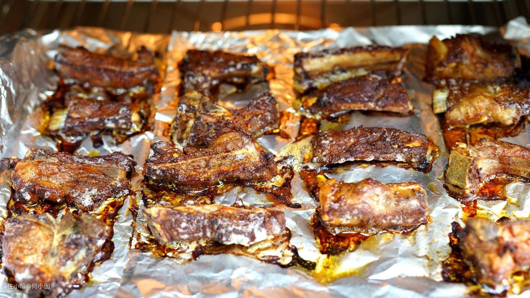 普通烤箱程序:锡纸包裹排骨,如果不包锡纸,表面会烤的很干,如果烤箱比较小,还需要最上方加盖锡纸,不然容易不均,220度预热,200度烤20分钟开锡纸,再烤10-15分钟上色,表面焦,加上预热全程需要40-50分钟