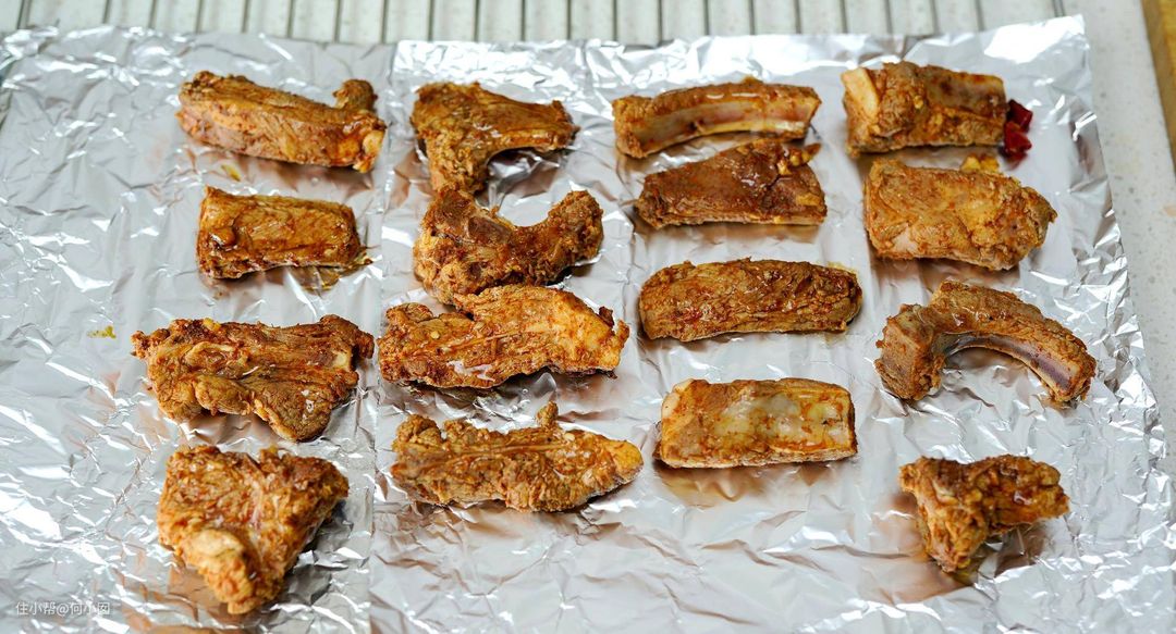 第二步用烤架或者烤盘上面放锡纸,摆放好排骨,刷油,需要注意的是,排骨没太多肥肉所以在腌制和烤之前最好都刷一点油,如果不刷会导致烤出来比较干
