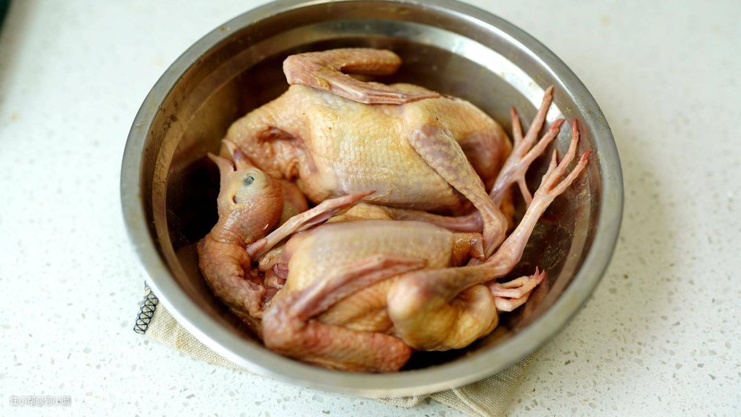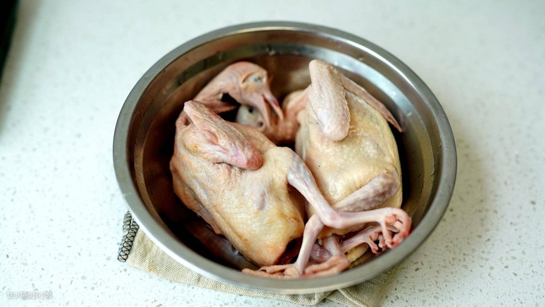 准备两只新鲜乳鸽和一包盐焗鸡粉,首先是腌制,盐焗鸡粉抹上去,腌制1-2小时就可以了
