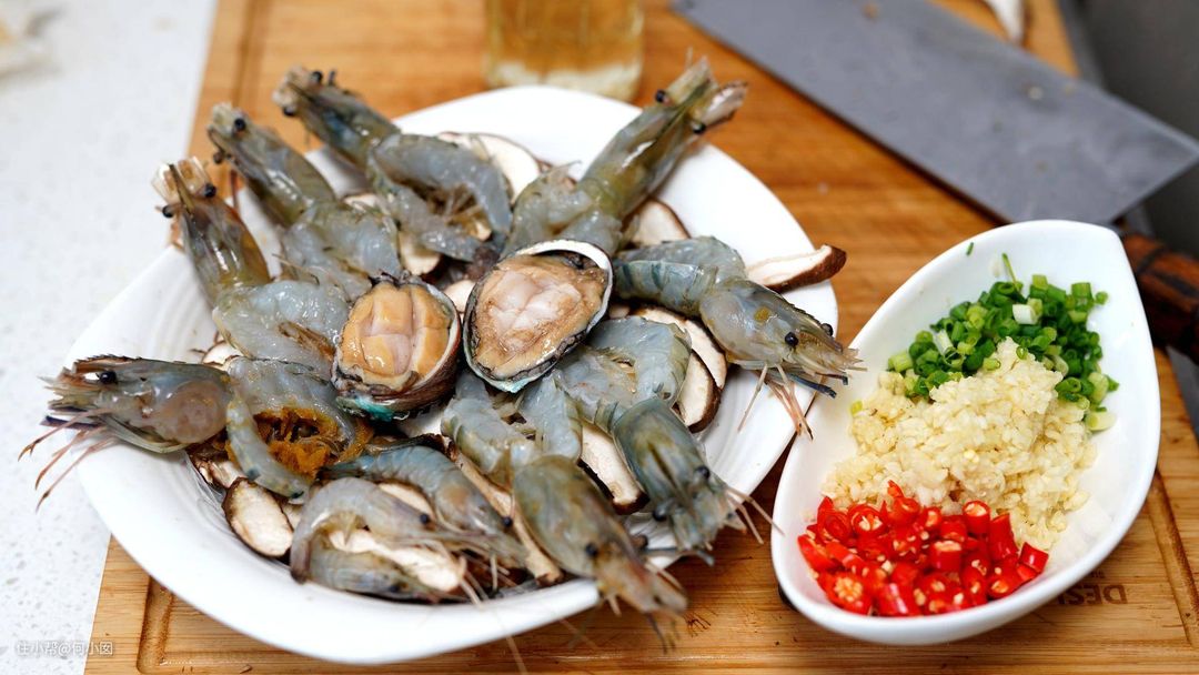 鲜虾开背去虾线,这里没什么要注意的,就是用快一些,薄一些的刀,小心不要切到手就好了,摆盘什么的你们随意,开心就好,我垫底了一点香菇片,一把泡软的粉丝,也可以不放,有两个鲍鱼,杀好,切了一个花刀一起蒸了