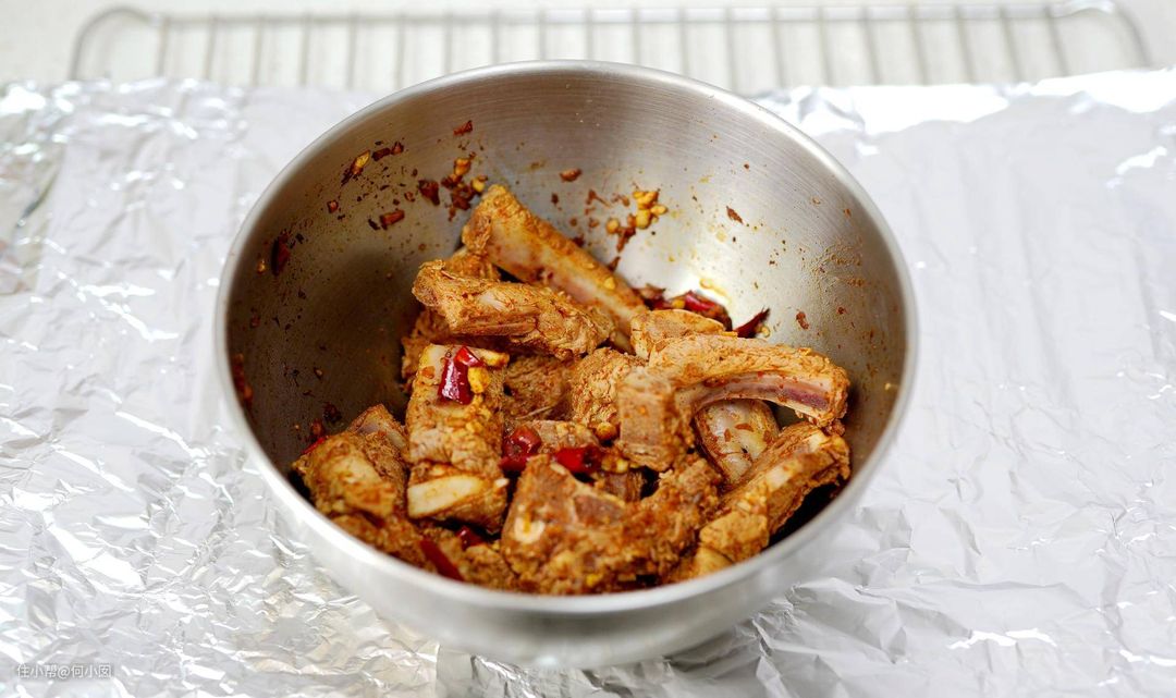第一步腌制排骨,根据自己的口味就可以,实在不会调料的,可以直接买袋装的排骨腌制酱料就行了,我放了姜蒜、一点料酒、两勺生抽、一点白糖、一勺辣椒粉,一点花椒粉,一点孜然粉,两勺油,一点盐,这些料够腌制三根排骨的,就是我图上这些,放冰箱,腌制时间是三小时,我腌制了一晚,如果时间紧张,也至少需要腌制1小时左右的,不然不入味
