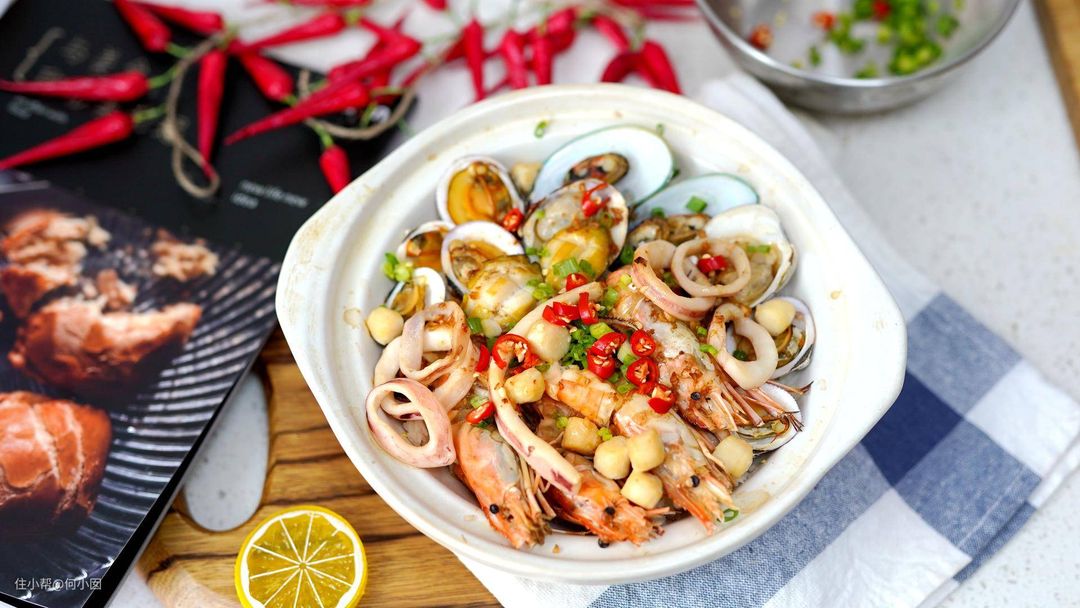 准备任意除了鱼以外的的海鲜适量,喜欢吃什么准备什么就可以,如果觉得每种都买一些太麻烦,我推荐你买京东这个海鲜杂烩,一袋可以做一次,很方便啊