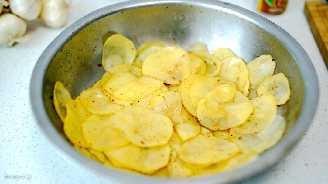 第二步腌制土豆,腌制大约半小时就够了,需要放一点盐和油,然后根据个人口味放孜然、辣椒粉,拌匀就行了