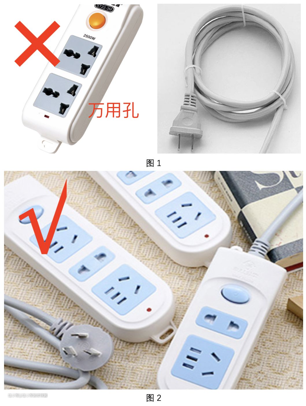 错误原因:万用孔插座板(如图1)在2010年已被禁止生产、销售,但很多家庭现在依旧使用,这是非常不明智的。①万用孔插座的三相和两相插孔合在一起,一共只有三个孔,因此插座不牢固,易被点燃。②万用孔插座一般没有安全门保护且插孔较大,小孩很容易将手插进去,发生触电事故。③万用孔插座一般售价十几块钱,产品质量难有保证。④万用孔插座自带插头为两插销,属于两芯问题插座,漏电时无地线保护,有较高安全隐患。