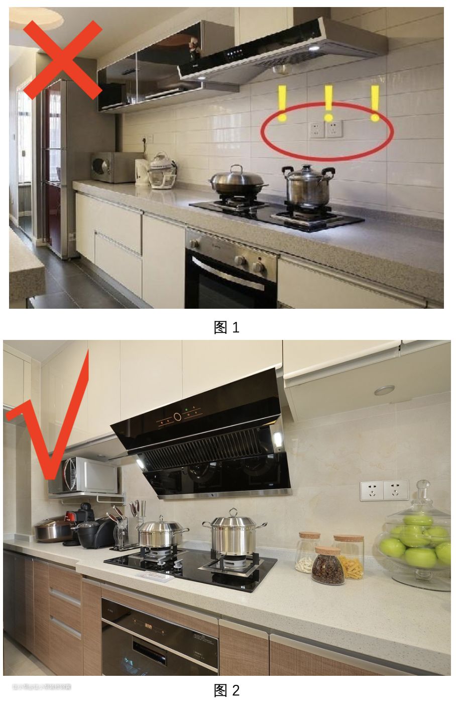 ②厨房内不建议使用插座板,一是易破坏美感易显房屋凌乱,二是插座不牢固,易移动因此被水、油等杂物溅入的可能性更高,安全隐患较大。
