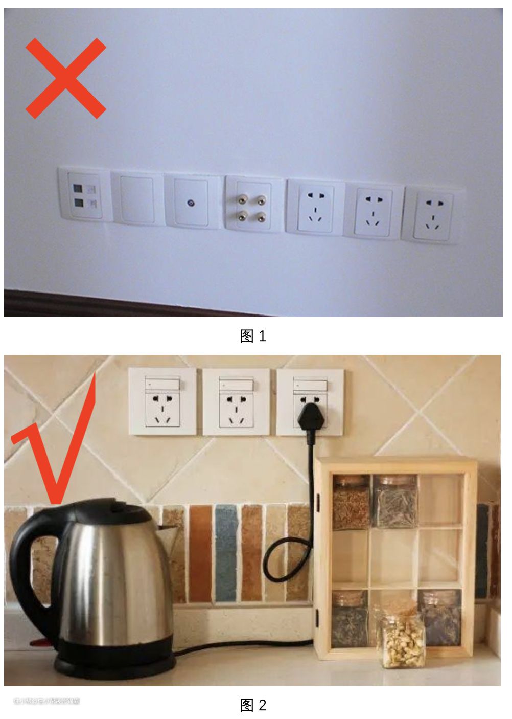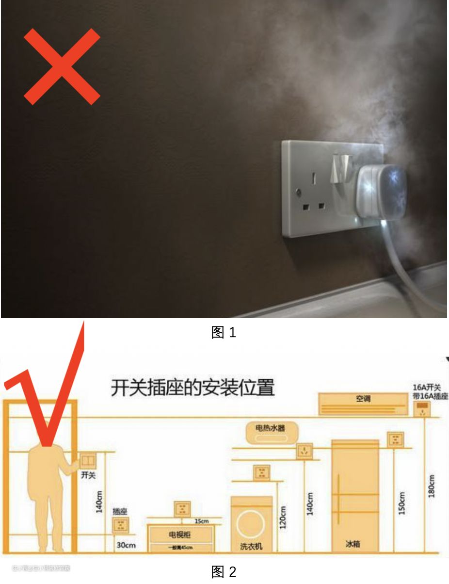 正确原因:专家建议,暗装插座时距地面高度最好不低于0.3米,明装插座最好不低于1.8米,厨房与卫生间的插座建议距地面1.4米以上,空调插座1.8米以上,如图2所示,这样使用起来更放心。