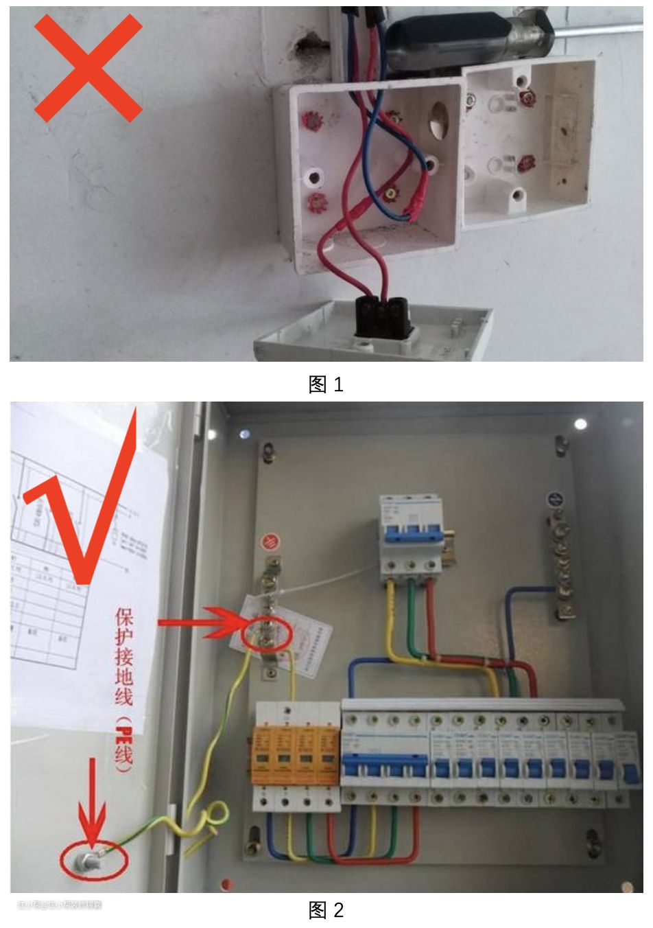 正确原因:图2中安装了漏电保护器的同时,又接了地线。如果发生漏电,电流会通过地线导入地面,并且会触发漏电保护器跳闸进行保护,这样可以更好保障家人、家电的安全。