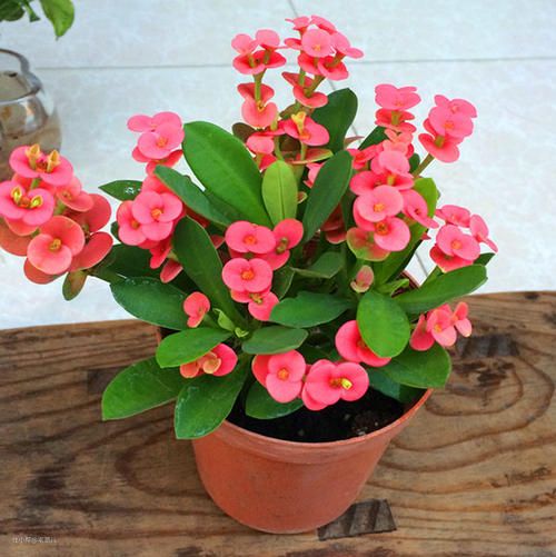 虎刺梅,有着褐色的木质化枝干,上面长着坚硬的刺;叶片革质翠绿色,枝条顶端开着小巧又柔美的小花,常见的有玫红色、粉红色、黄色,像梅花,又像海棠,精致惹人喜爱。
