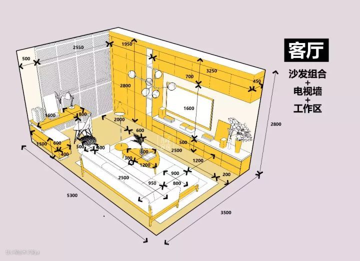 尺寸注意事项:如果户型面积在80㎡以下,家庭核心区空间有限,可以考购买超大的餐桌,一边做工作台一边做餐桌,购买2米的二人沙发会客。面积在80-120㎡的中户型,可以中间位置做会客区,靠近阳台左右两边位置做休息区和会客区。而户型面积在120㎡以上,可以在家庭核心区背后专门设置一个办公会客区。书桌高度建议为740mm,书桌底下有抽屉时,建议抽屉高度不要超过13cm,不然起身的时候容易撞到膝盖。书桌下面的活动区域想要足够的活动空间,要保证桌子底下的高度不低于580cm,就可以自由舒展。